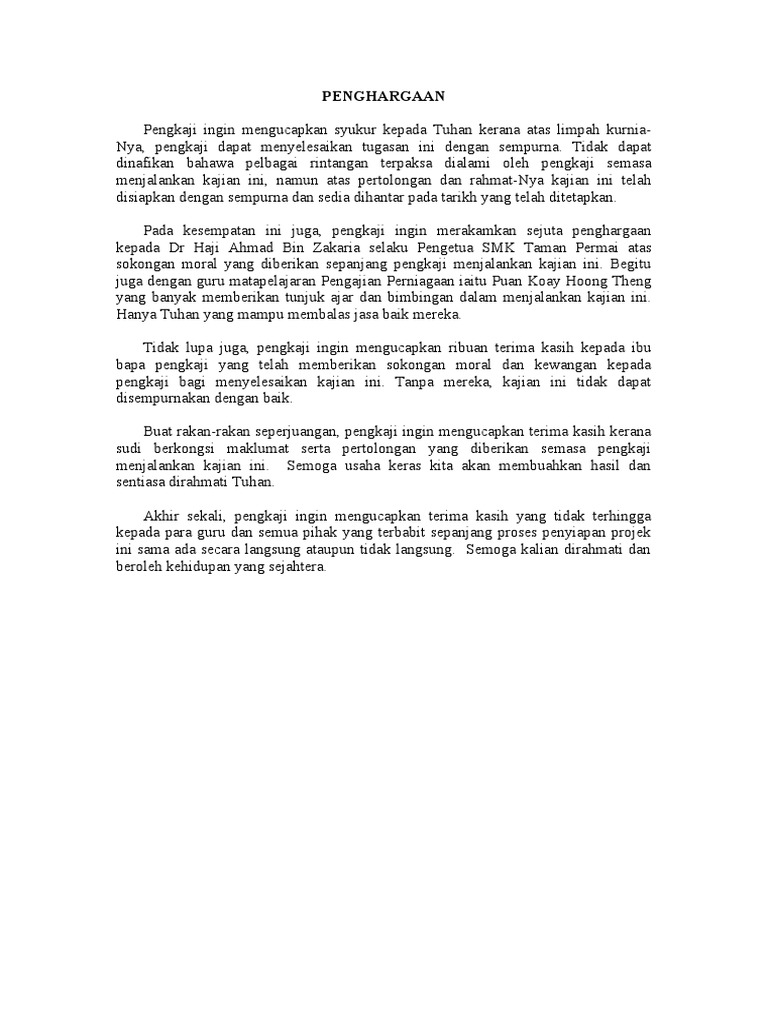Ainafarzana menerbitkan KERJA KURSUS PENGAJIAN PERNIAGAAN 2020 pada 2020-11-27. Isi kandungan tajuk penghargaan abstrak isi kandungan pengenalan objektif kajian latar belakang kajian kaedah kajian dapatan kajian rumusan rujukan lampiran penghargaan pengkaji ingin mengucapkan syukur kepada tuhan. 11 PENGHARGAAN Alhamdulilah syukur ke hadrat illahi kerana dengan limpah dan kurnia-Nya maka saya dapat menyiapkan kertas projek ini dengan.